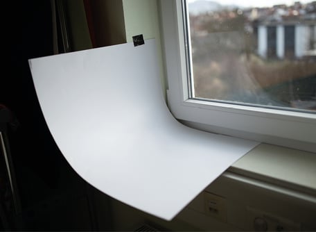 Sollten Sie an Ihrer Fensterbank wenig Platz haben, können Sie die Unterlage auch ganz einfach temporär mit Klebeband daran befestigen. Wichtig ist, dass Ihr Papierhintergrund eine kleine Kurve bildet, so hat der Hintergrund auf Ihrem Foto keine störenden Linien. Achten Sie auch darauf, dass keine weiteren Gegenstände wie Werkzeug oder Deko im Bild zu sehen sind - diese lenken nur vom Hauptmotiv ab.