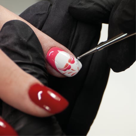 Mit dem Spot Swirl und UV/LED nail polish goals Punkte als Blütenmitte setzen. Mit UV/LED nail polish routines weitere Punkte um goals zu einer Blüte setzen. Außerdem Punkte in der
