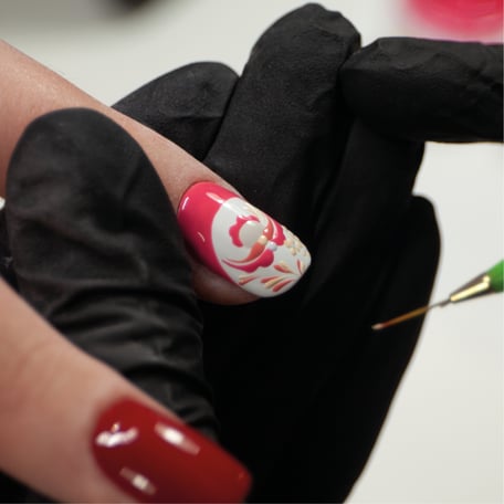 Zwischen die Blätter mit UV/LED nail polish black Stängel ziehen und mit black und trust yourself Verzierungen um die Schnörkel setzen. Danach die Nail Art mit UV/LED Highgloss versiegeln.