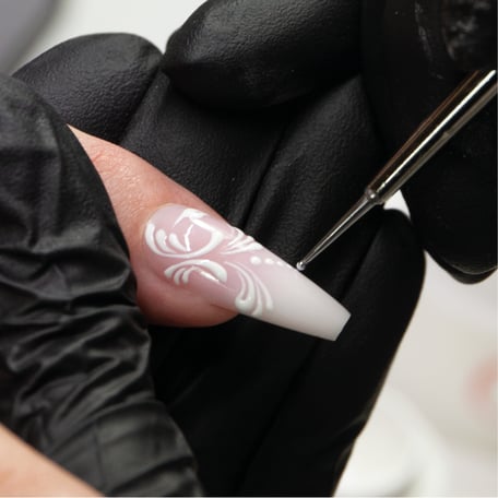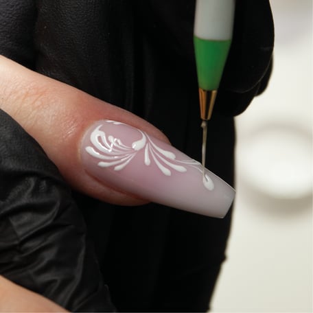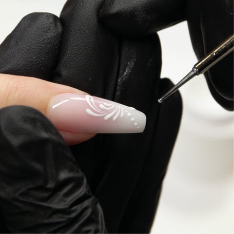 mit Our Best Gel medium violetrose und opalwhite im Babyboomer-Look designen und mit UV/LED Highgloss versiegeln. Dann auf den gewünschten Nägeln mit den Schnörkeln beginnen.