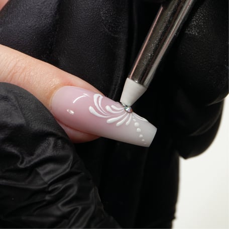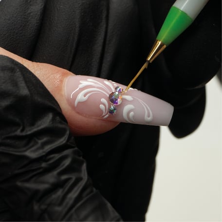 Etwas UV/LED Highgloss auf die Schnörkelmitte geben - nicht aushärten. Mit dem Pick & Place Strasssteine aus der aurore selection aufnehmen und vereinzelt in den Schnörkeln platzieren, dann aushärten.